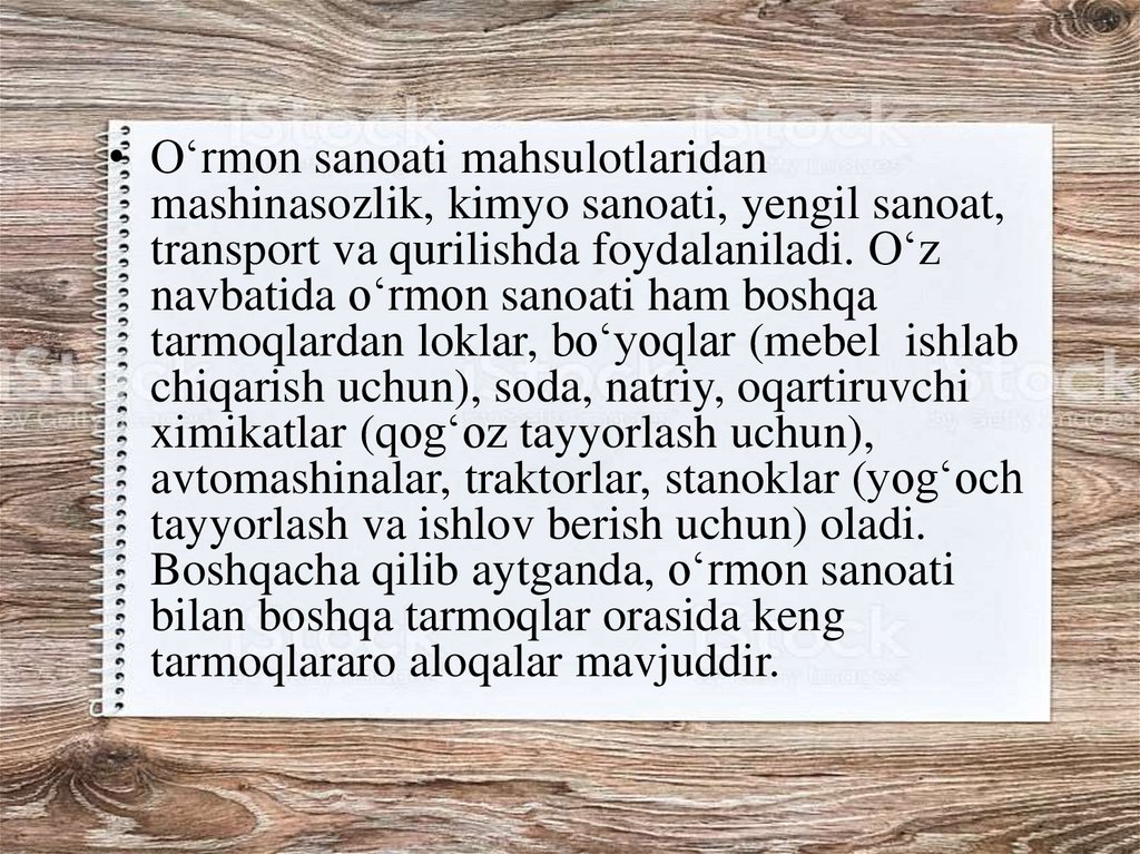 • O‘rmon sanoati yog‘och tayyorlash va yog‘ochniqayta ishlash tarmoqlariga bo‘linadi. Yog‘ochni