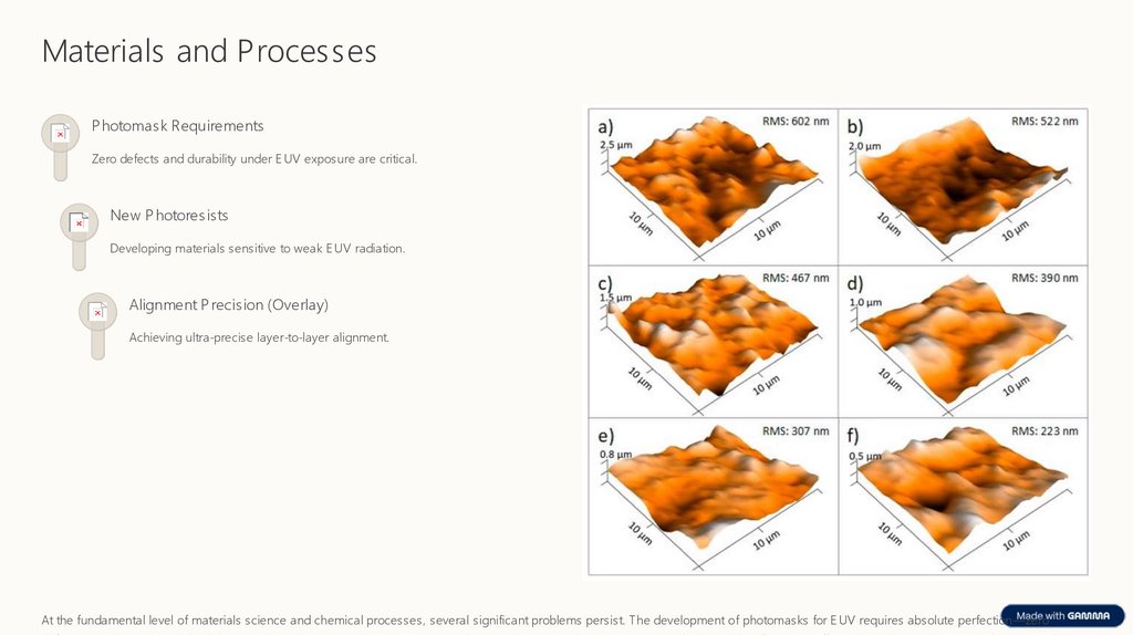 At the fundamental level of materials science and chemical processes, several significant problems persist. The development of photomasks for E UV requires absolute perfection—zero