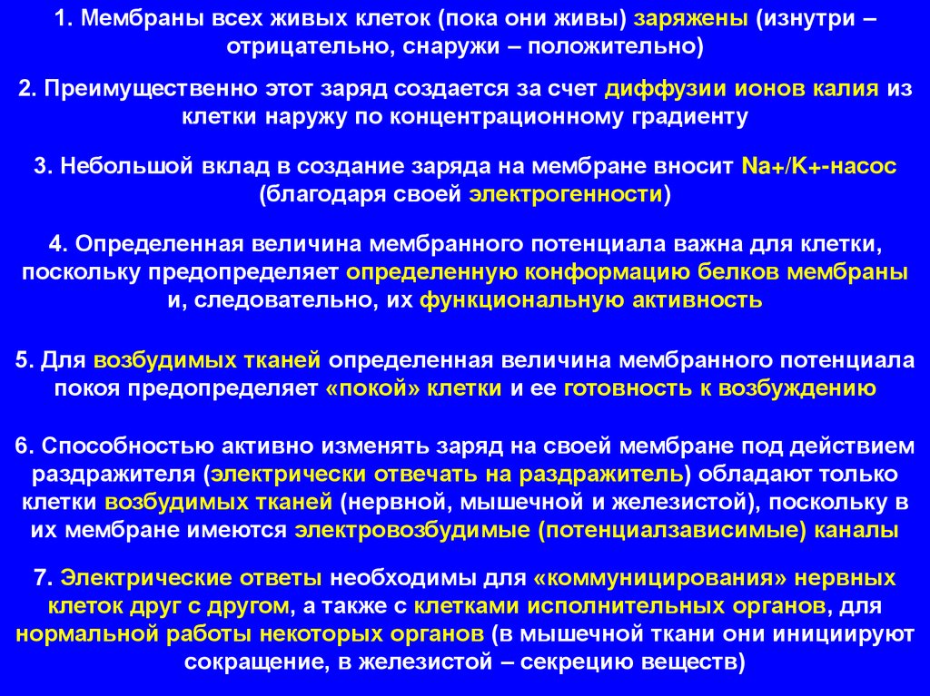 1. Мембраны всех живых клеток (пока они живы) заряжены (изнутри –отрицательно, снаружи – положительно)