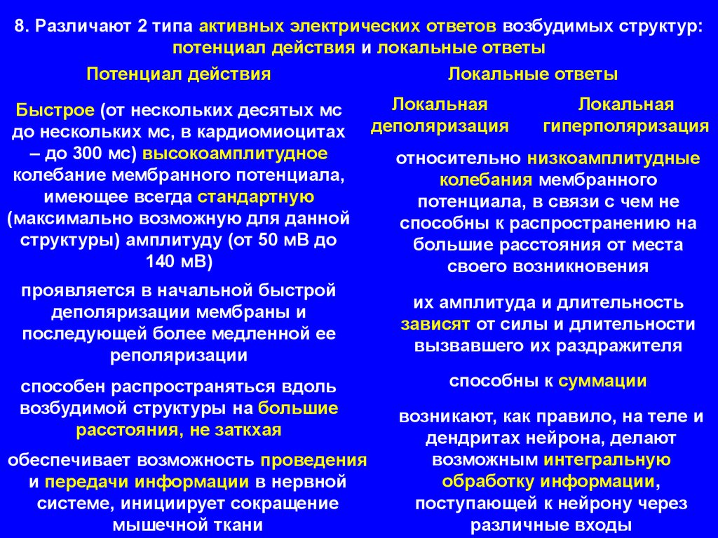 8. Различают 2 типа активных электрических ответов возбудимых структур:потенциал действия и локальные ответы