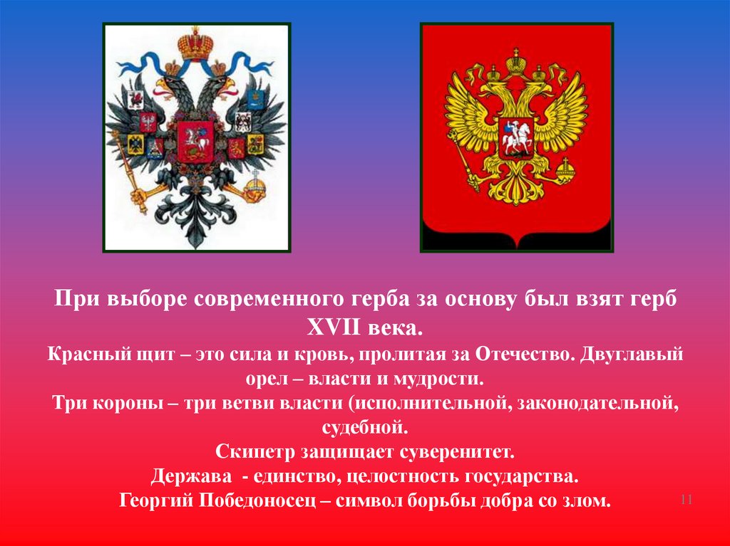 Красный щит – это сила и кровь, пролитая за Отечество. Двуглавый