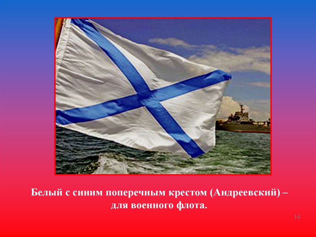 Белый с синим поперечным крестом (Андреевский) –для военного флота.