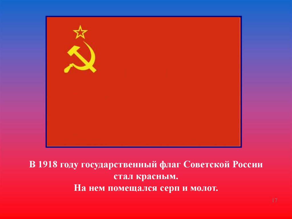 В 1918 году государственный флаг Советской Россиистал красным.