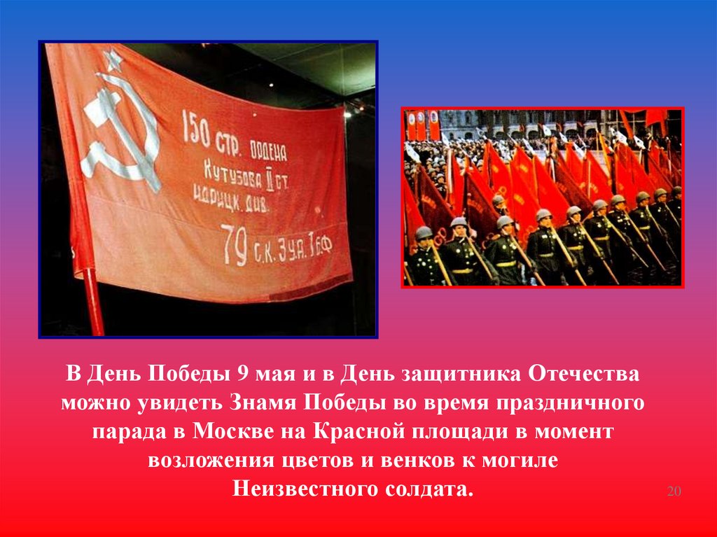 В День Победы 9 мая и в День защитника Отечестваможно увидеть Знамя Победы во время праздничного