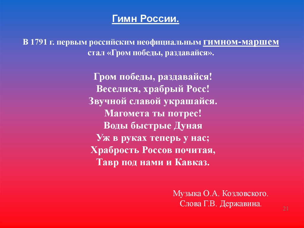 Гимн России.В 1791 г. первым российским неофициальным гимном-маршем