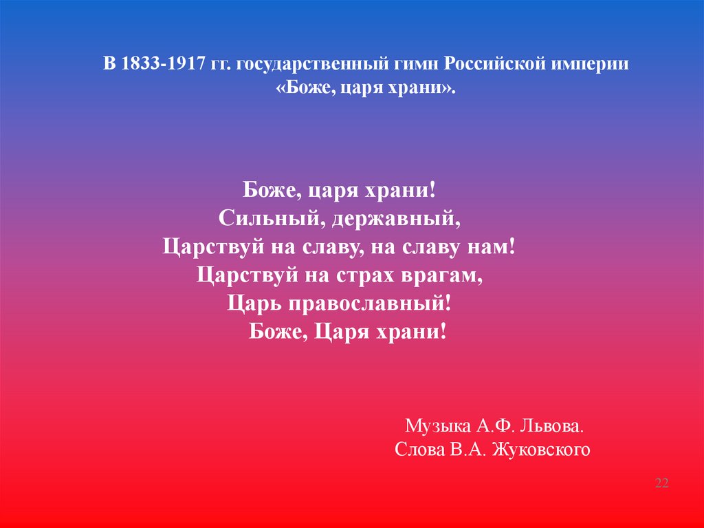 В 1833-1917 гг. государственный гимн Российской империи«Боже, царя храни».