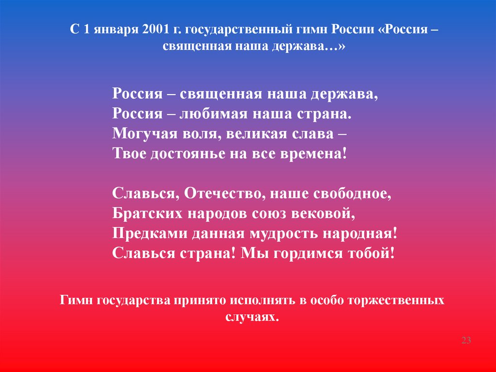 С 1 января 2001 г. государственный гимн России «Россия –священная наша держава…»