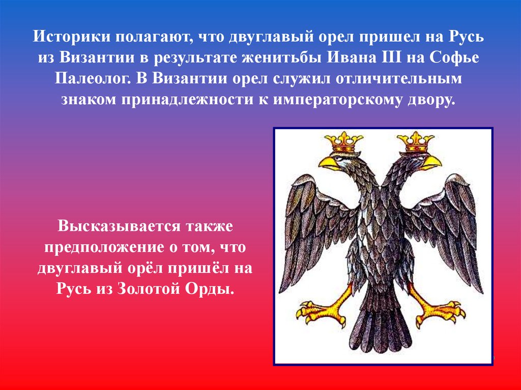 Историки полагают, что двуглавый орел пришел на Русьиз Византии в результате женитьбы Ивана III на Софье