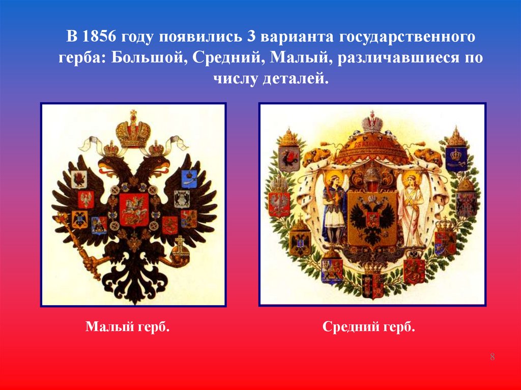 В 1856 году появились 3 варианта государственногогерба: Большой, Средний, Малый, различавшиеся по