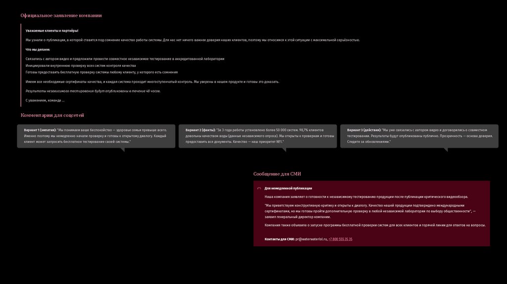 Наша компания заявляет о готовности к независимому тестированию продукции после публикации критического видеообзора.