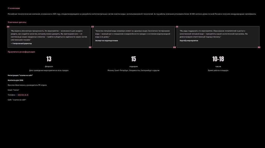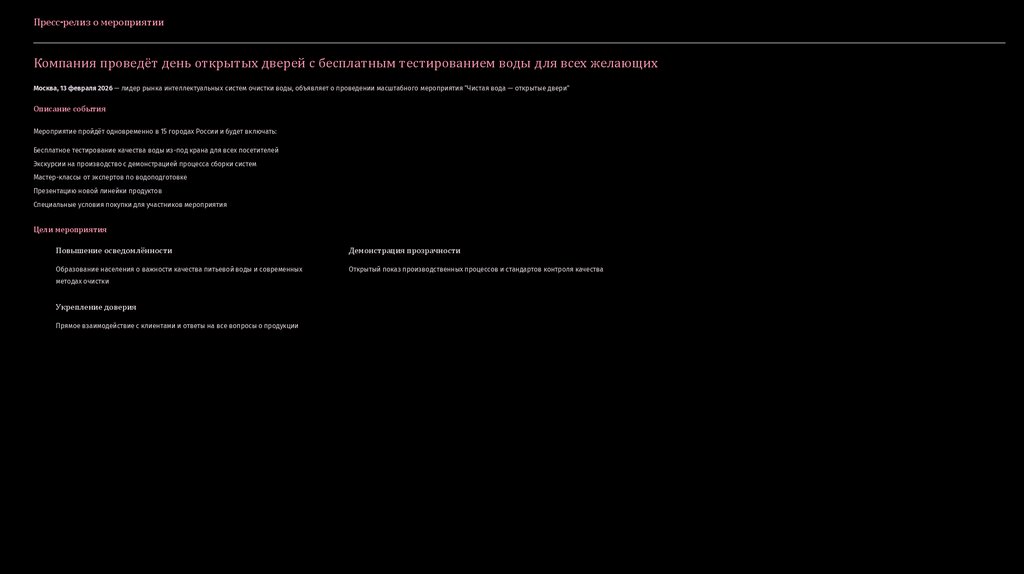 Пресс-релиз о мероприятииКомпания проведёт день открытых дверей с бесплатным тестированием воды для всех желающих