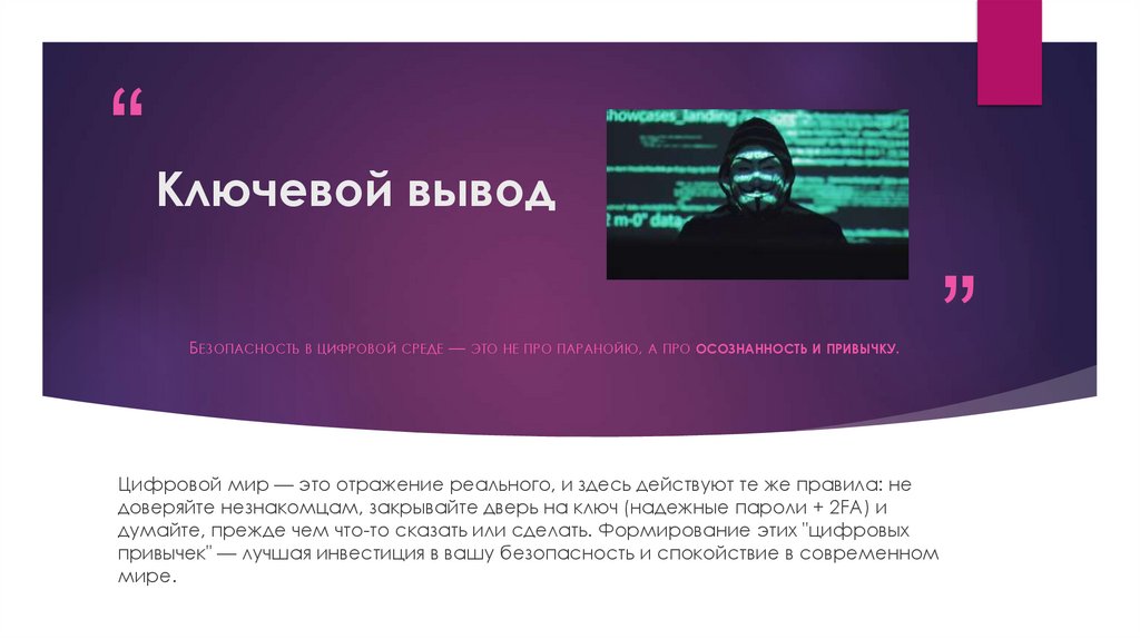 “ Ключевой выводБЕЗОПАСНОСТЬ В ЦИФРОВОЙ СРЕДЕ — ЭТО НЕ ПРО ПАРАНОЙЮ, А ПРО ОСОЗНАННОСТЬ И ПРИВЫЧКУ.