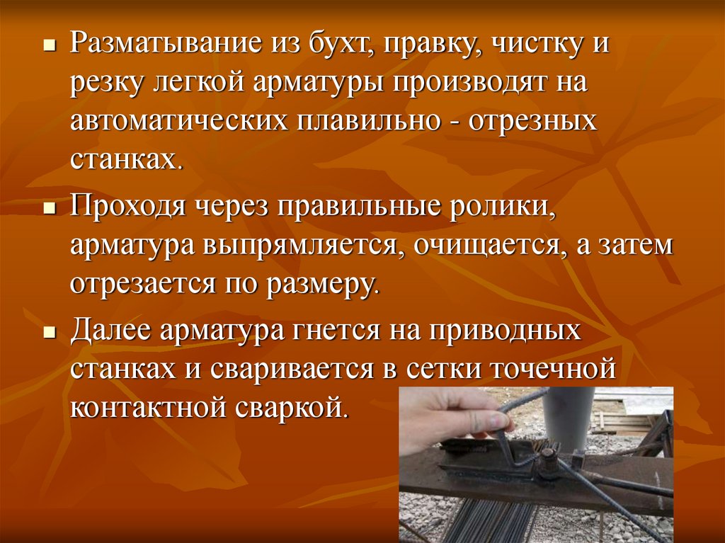 Paзматывание из бухт, правку, чистку ирезку легкой арматуры производят на