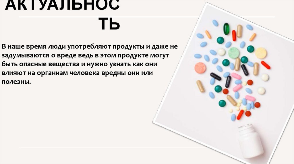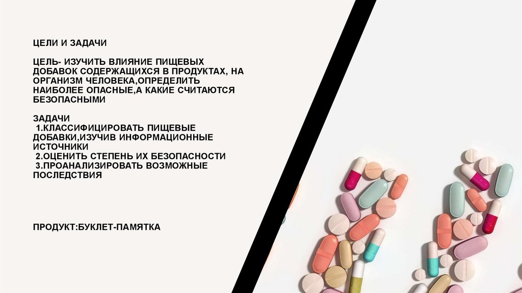 3. Цели и задачи ЦЕЛЬ- Изучить влияние пищевых добавок содержащихся в продуктах, на организм человека,определить наиболее