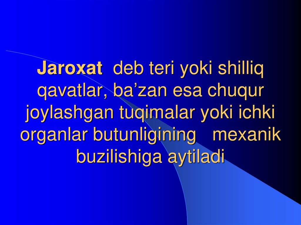 3. Jaroxat deb teri yoki shilliq qavatlar, ba’zan esa chuqur joylashgan tuqimalar yoki ichki organlar butunligining mexanik