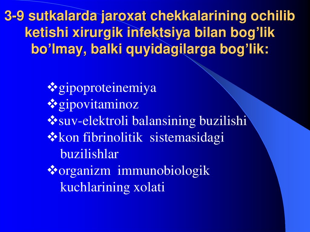 28. 3-9 sutkalarda jaroxat chekkalarining ochilib ketishi xirurgik infektsiya bilan bog’lik bo’lmay, balki quyidagilarga bog’lik: