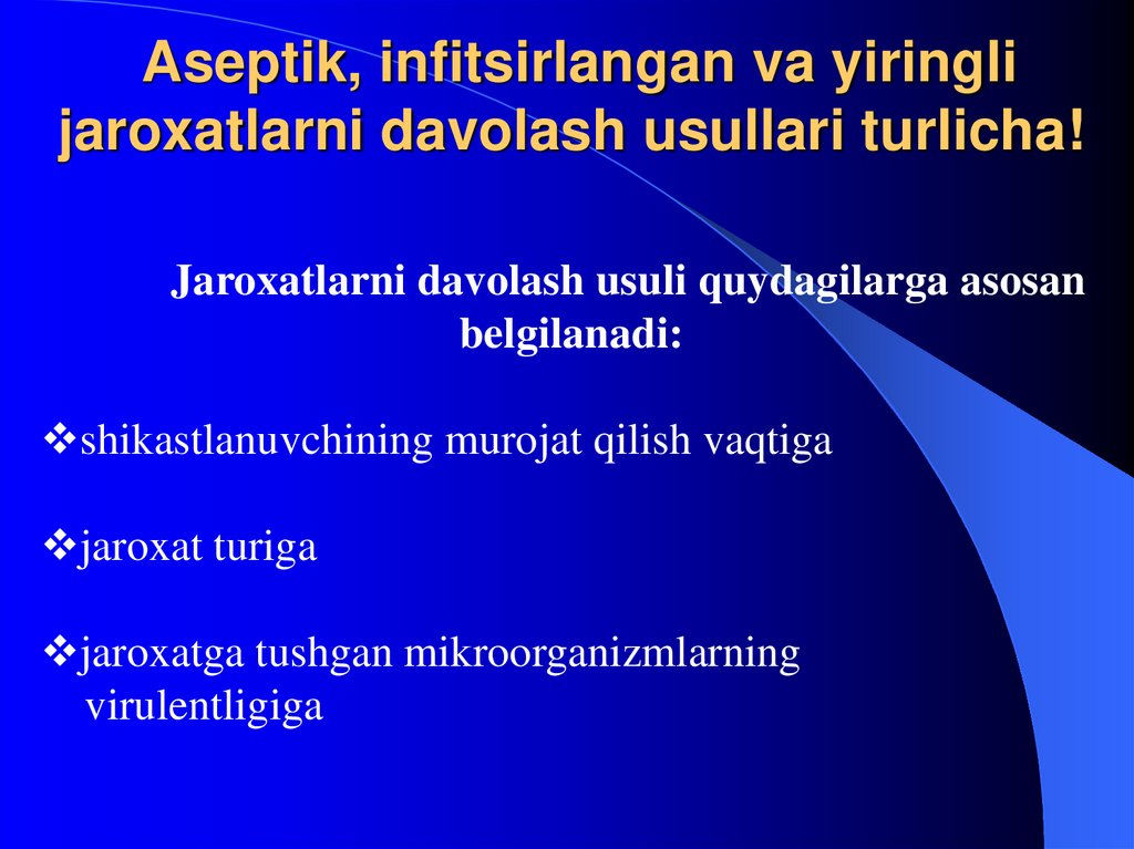 34. Aseptik, infitsirlangan va yiringli jaroxatlarni davolash usullari turlicha!