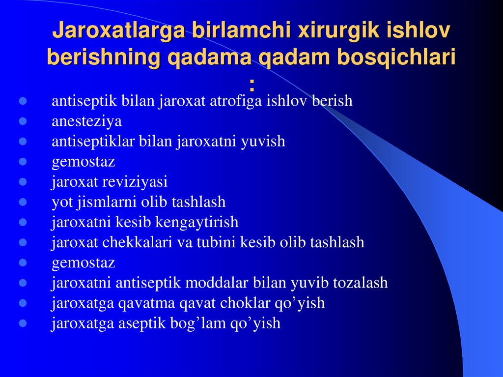 37. Jaroxatlarga birlamchi xirurgik ishlov berishning qadama qadam bosqichlari :
