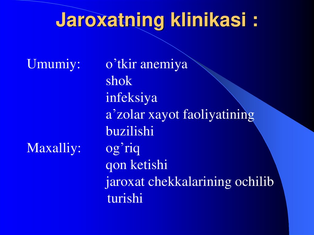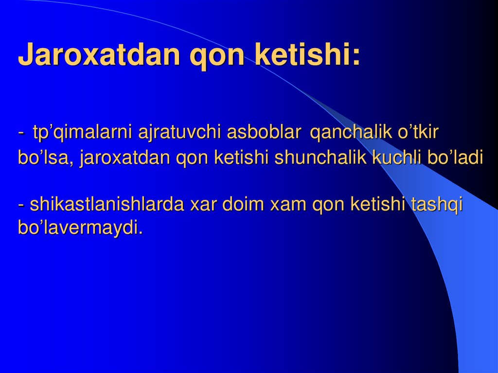 6. Jaroxatdan qon ketishi: - tp’qimalarni ajratuvchi asboblar qanchalik o’tkir bo’lsa, jaroxatdan qon ketishi shunchalik kuchli