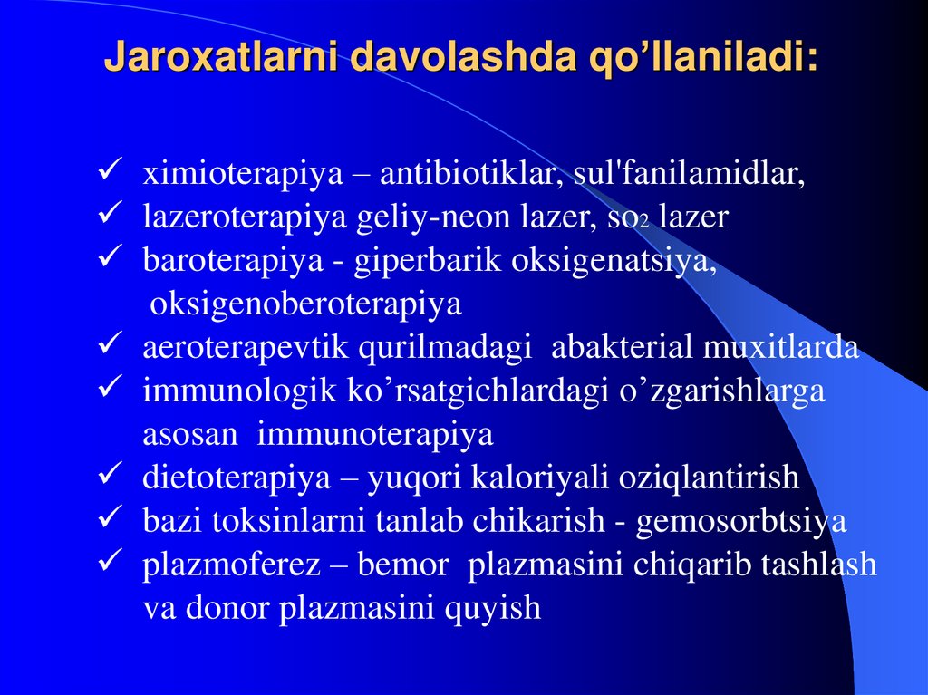 ximioterapiya – antibiotiklar, sul'fanilamidlar,lazeroterapiya geliy-neon lazer, so2 lazer