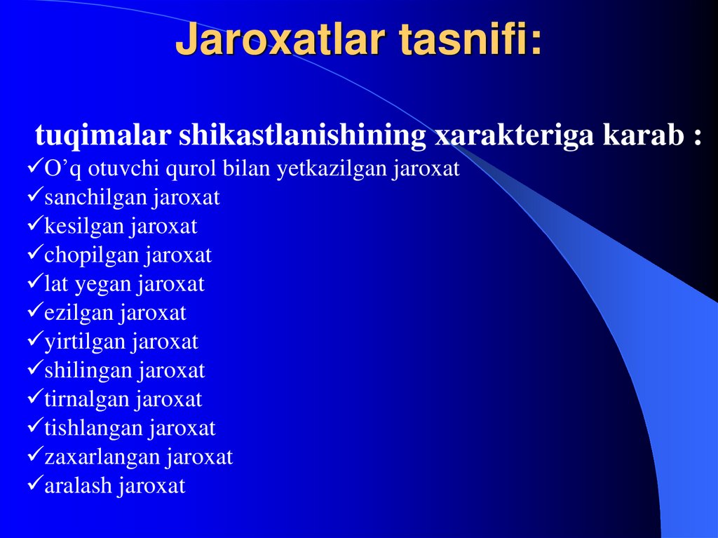 tuqimalar shikastlanishining xarakteriga karab :O’q otuvchi qurol bilan yetkazilgan jaroxat