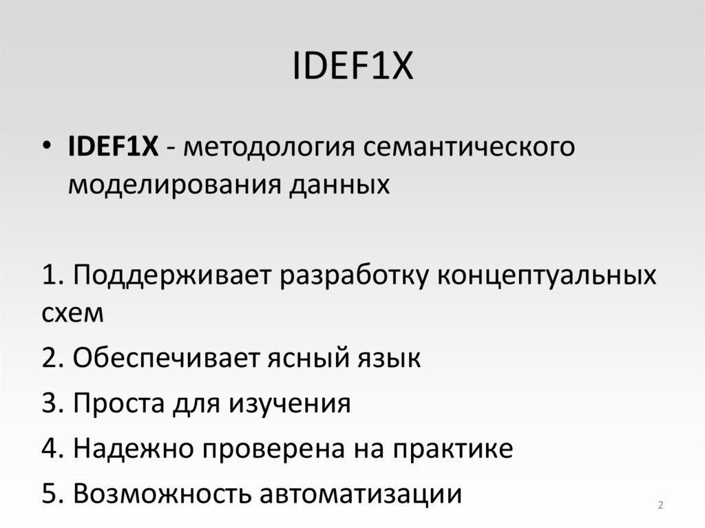• IDEF1X - методология семантическогомоделирования данных