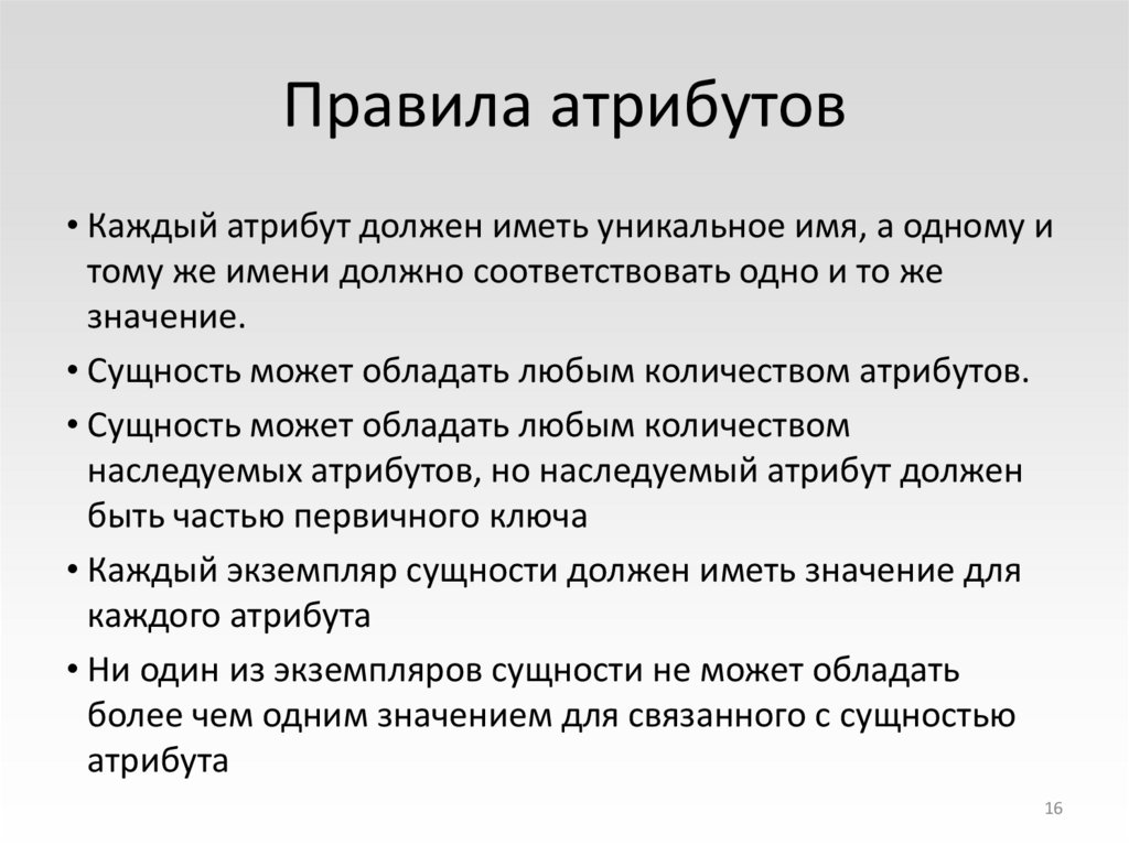 • Каждый атрибут должен иметь уникальное имя, а одному итому же имени должно соответствовать одно и то же