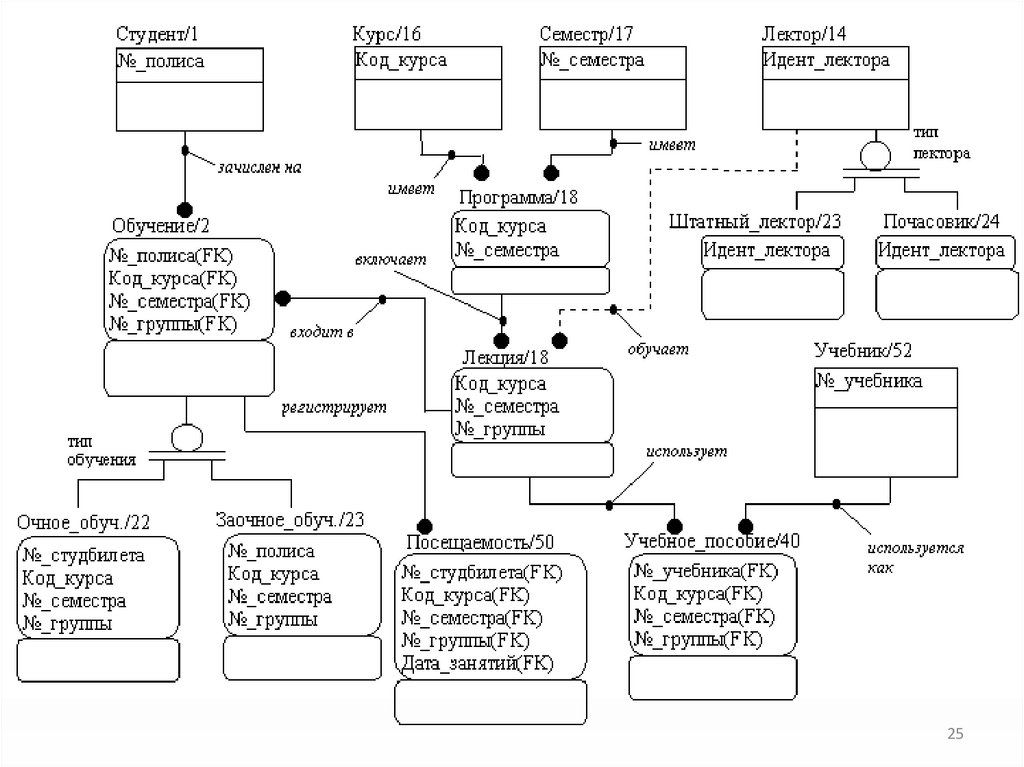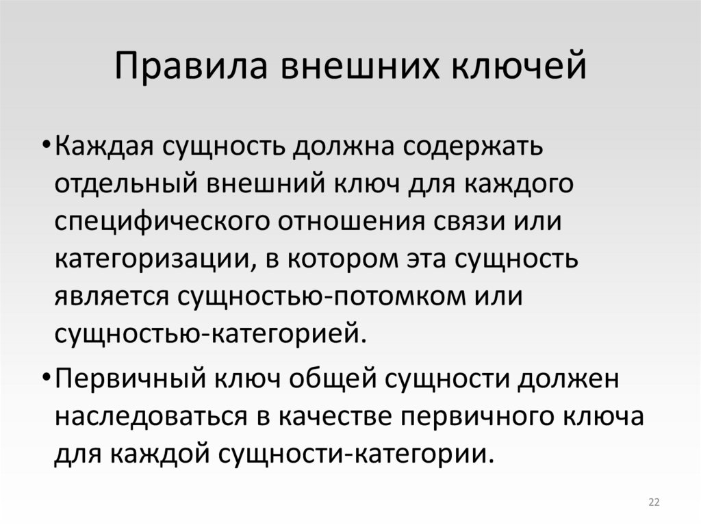 • Сущность не должна содержать двух полных внешнихключей, которые идентифицируют один и тот же