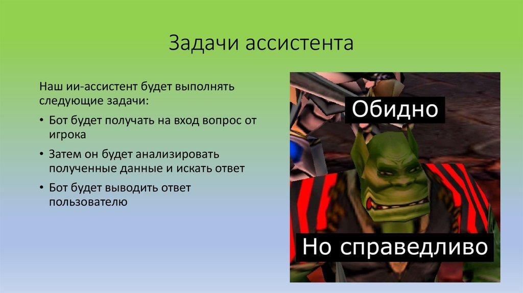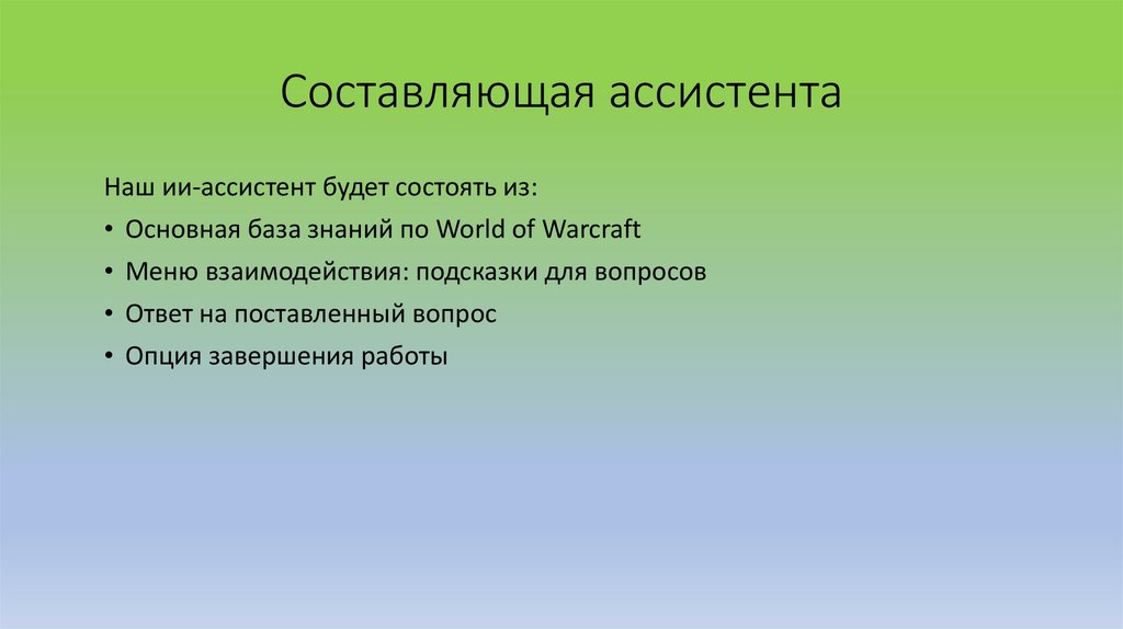 Наш ии-ассистент будет состоять из:• Основная база знаний по World of Warcraft