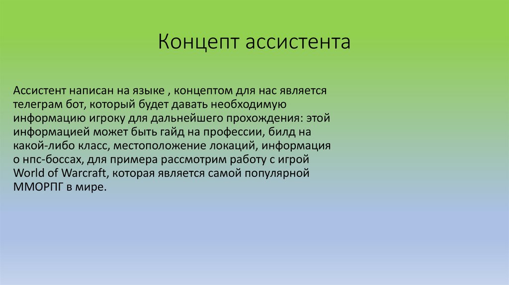 Ассистент написан на языке , концептом для нас являетсятелеграм бот, который будет давать необходимую