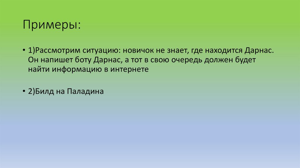 • 1)Рассмотрим ситуацию: новичок не знает, где находится Дарнас.Он напишет боту Дарнас, а тот в свою очередь должен будет