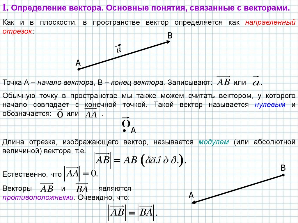 I. Определение вектора. Основные понятия, связанные с векторами.Как и в плоскости, в пространстве вектор определяется как направленный