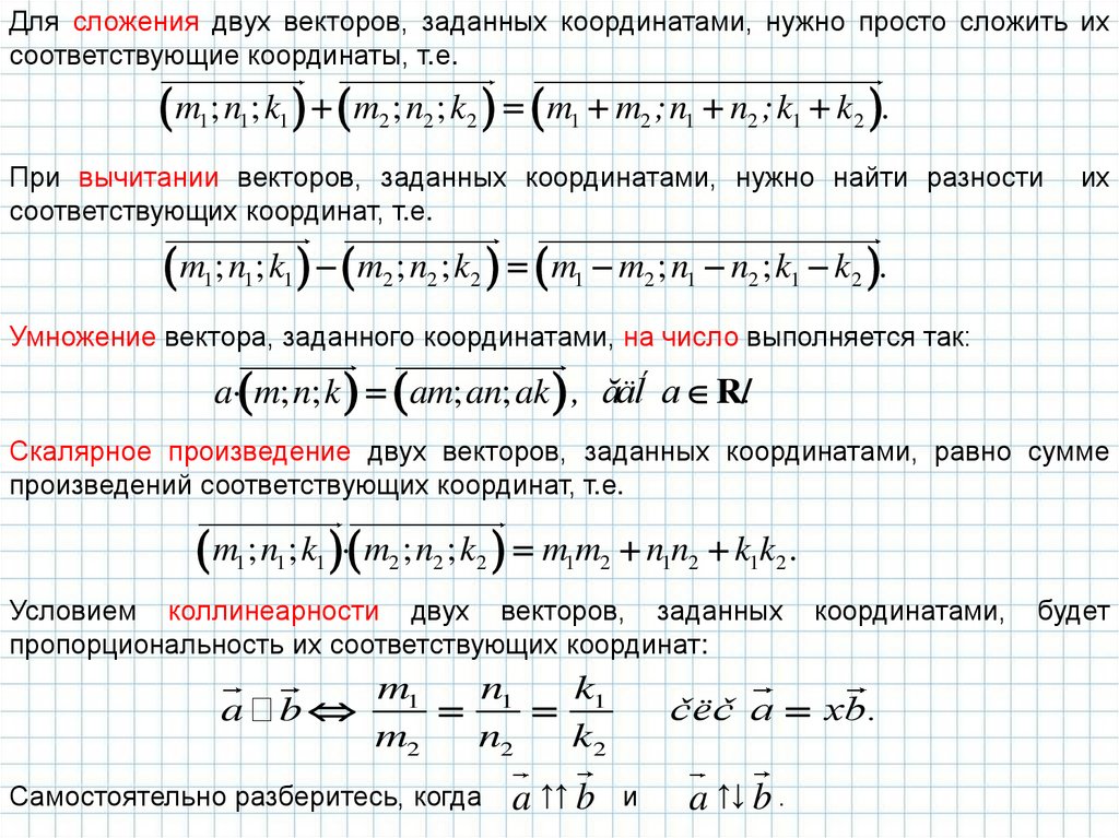 Два вектора, заданные координатами a m1 ; n1 ; k1 è b m2 ; n2 ; k2 будут равны,