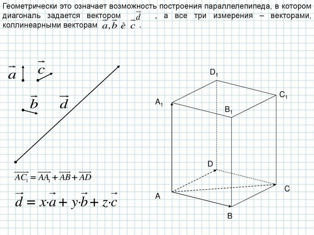 Геометрически это означает возможность построения параллелепипеда, в которомдиагональ задается вектором