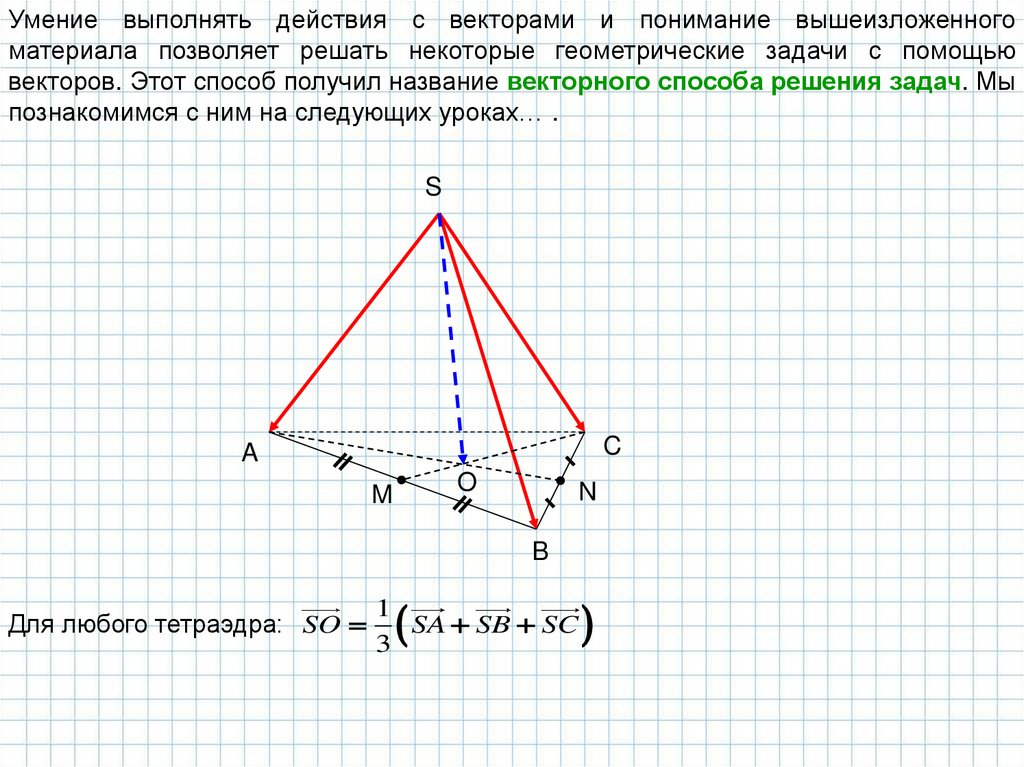 Умение выполнять действия с векторами и понимание вышеизложенногоматериала позволяет решать некоторые геометрические задачи с помощью