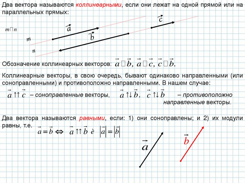 Два вектора называются коллинеарными, если они лежат на одной прямой или напараллельных прямых: