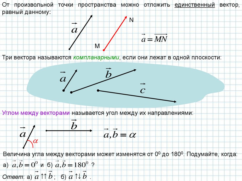 От произвольной точки пространства можно отложить единственный вектор,равный данному: