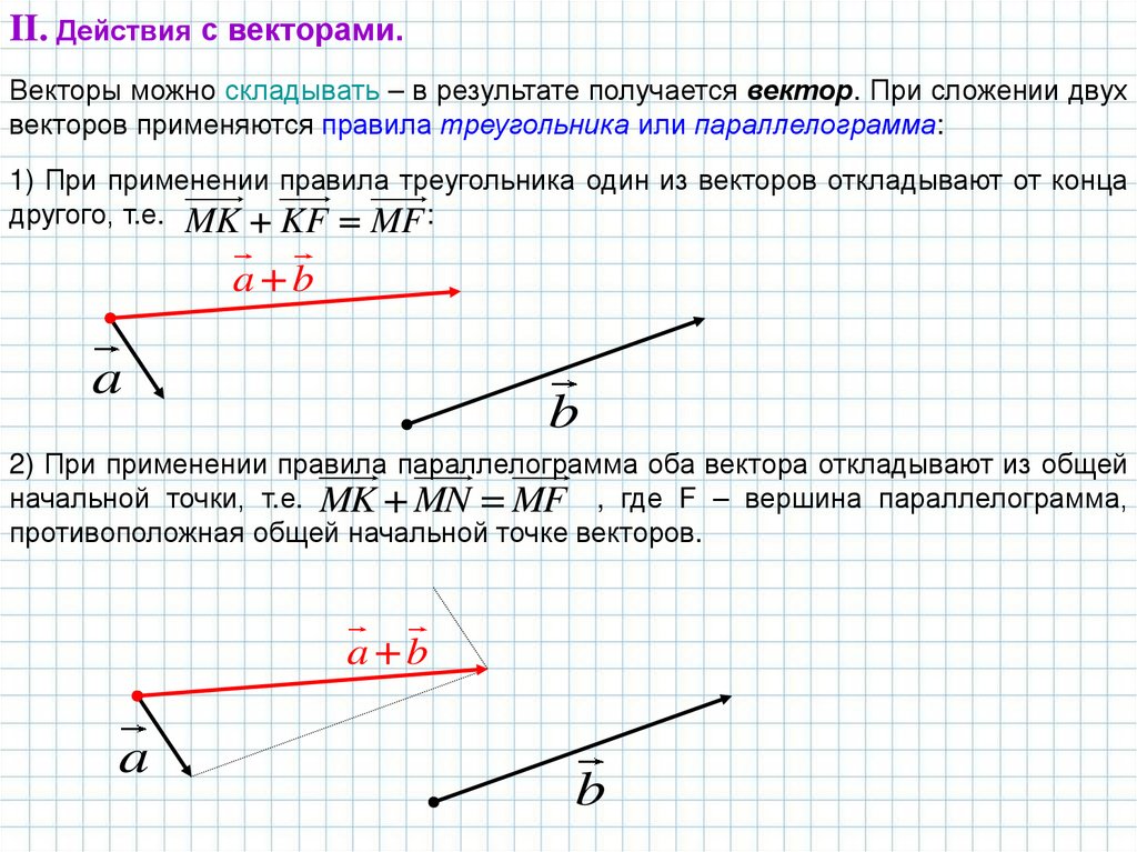 II. Действия с векторами.Векторы можно складывать – в результате получается вектор. При сложении двух