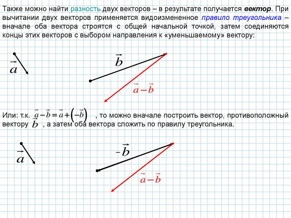 Также можно найти разность двух векторов – в результате получается вектор. Привычитании двух векторов применяется видоизмененное правило треугольника –