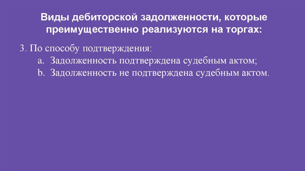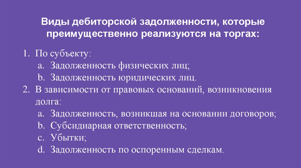 Виды дебиторской задолженности, которыепреимущественно реализуются на торгах: