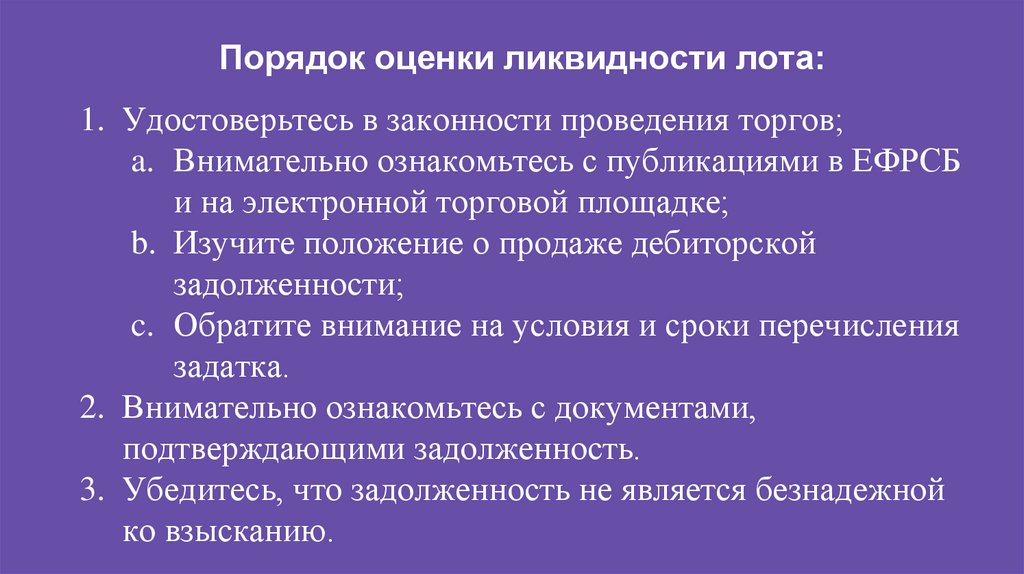 Порядок оценки ликвидности лота:1. Удостоверьтесь в законности проведения торгов;
