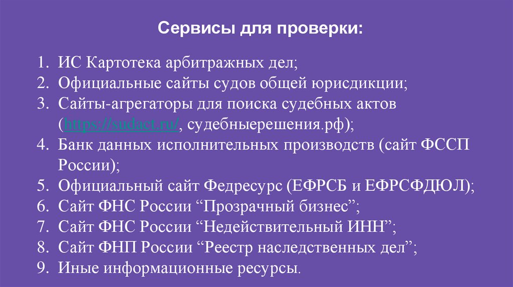 Сервисы для проверки:1. ИС Картотека арбитражных дел;