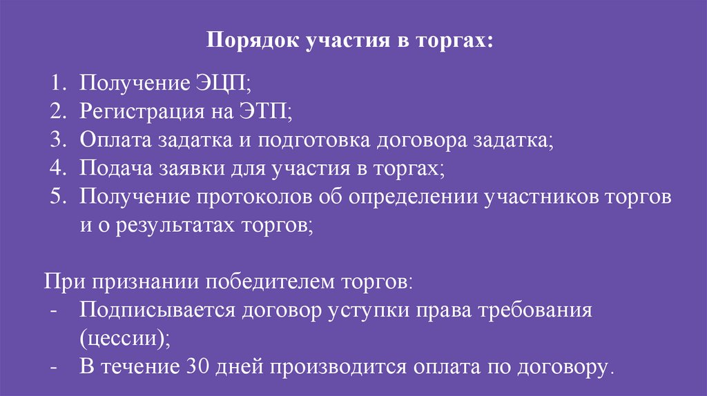 Порядок участия в торгах:1. Получение ЭЦП;
