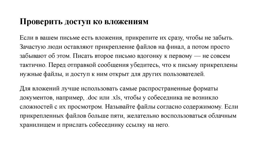 Проверить доступ ко вложениямЕсли в вашем письме есть вложения, прикрепите их сразу, чтобы не забыть.