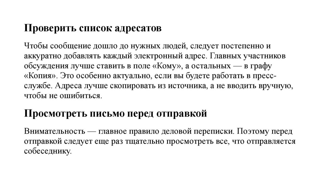 «Копия». Это особенно актуально, если вы будете работать в прессслужбе. Адреса лучше скопировать из источника, а не вводить вручную,