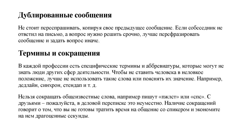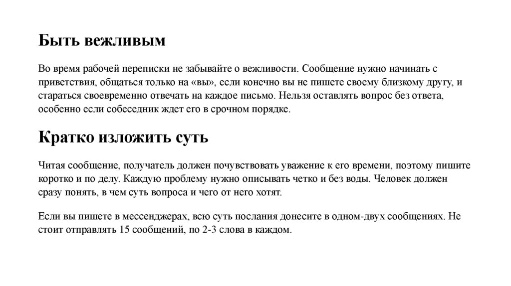Читая сообщение, получатель должен почувствовать уважение к его времени, поэтому пишите