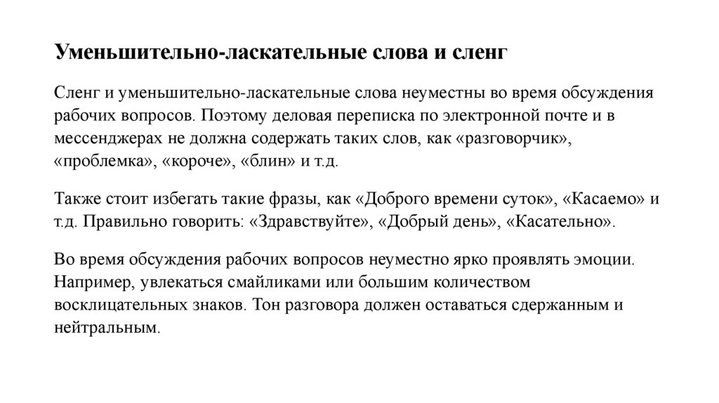 Уменьшительно-ласкательные слова и сленгСленг и уменьшительно-ласкательные слова неуместны во время обсуждения