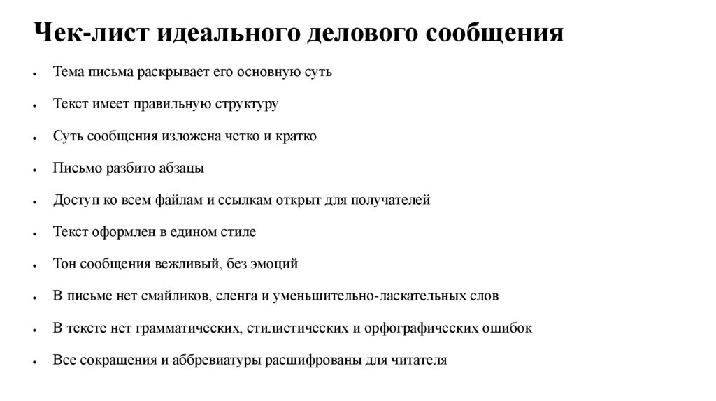 Чек-лист идеального делового сообщенияТема письма раскрывает его основную суть