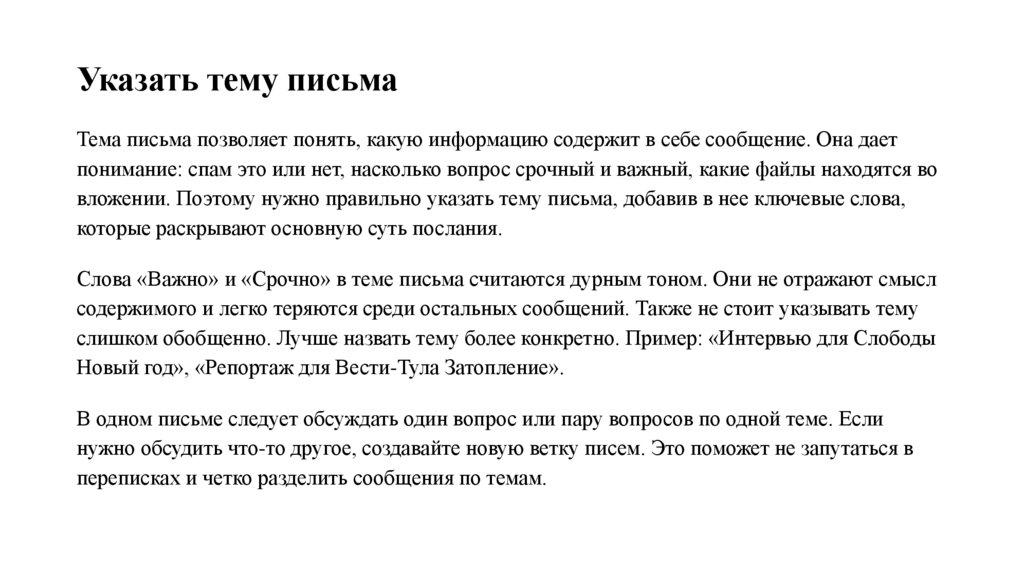 Указать тему письмаТема письма позволяет понять, какую информацию содержит в себе сообщение. Она дает