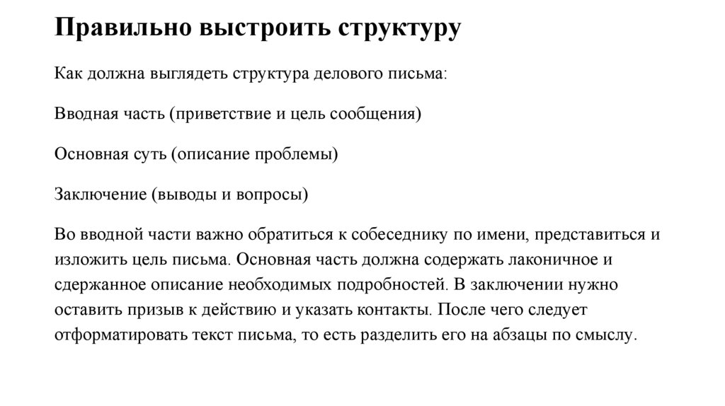 Как должна выглядеть структура делового письма:Вводная часть (приветствие и цель сообщения)